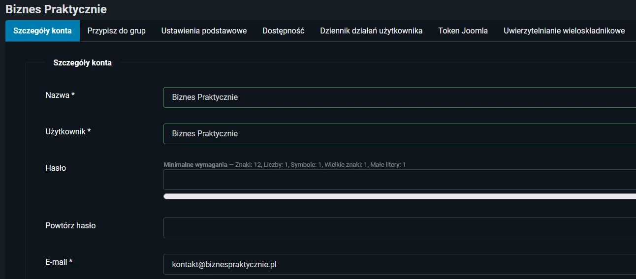 Tutaj zmienisz swoje hasło. Pamiętaj, aby hasło było unikalne, nie było używane przez Ciebie w żadnym innym systemie. Było odpowiednio skomplikowane, losowe.Dostosuj konto -> Zakładka przypisz do grup