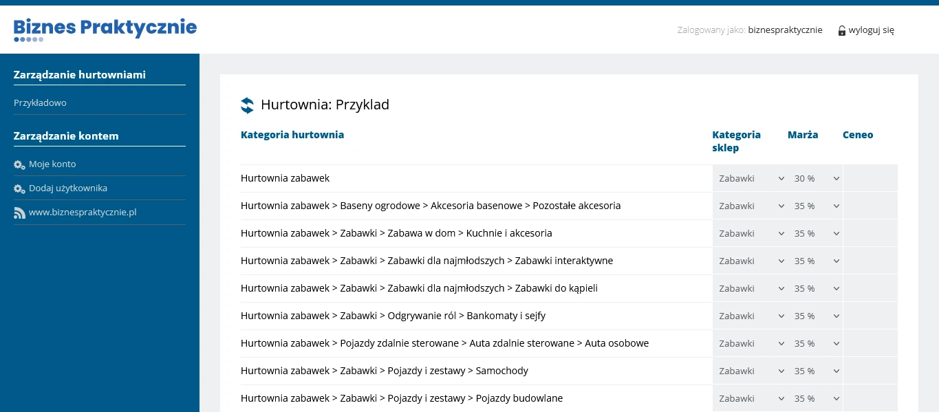 Dla każdej kategorii produktów możecie Państwo ustalić osobną marżę. Np. dla produktów z kategorii Zabawki -> Gry marża może być inna niż dla produktów z kategorii z hartowni Zabawki -> Pluszaki.